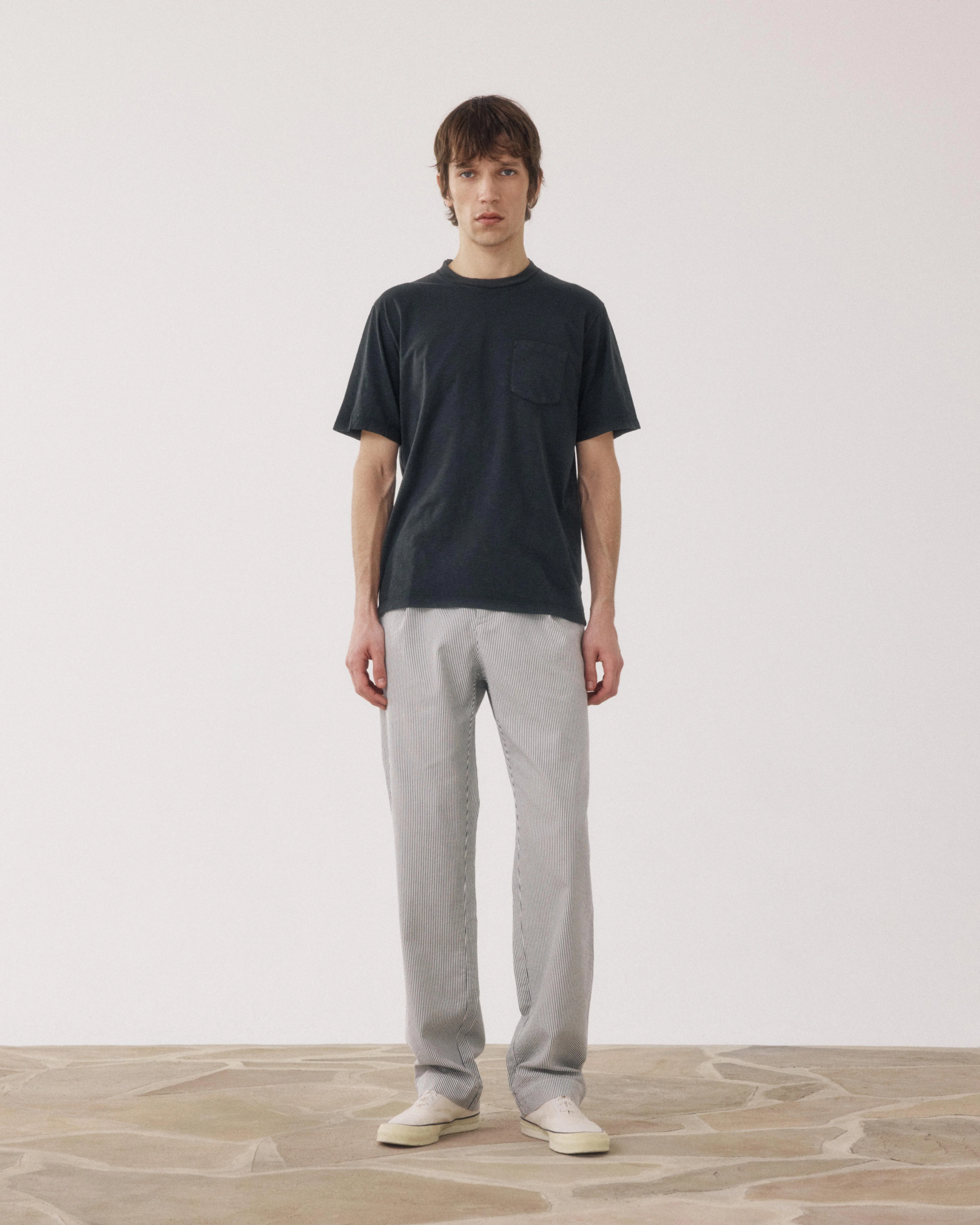 Pantalon homme à la coupe droite avec une pince. Ceinture semi-élastiquée avec passants. Fermeture glissière à bouton.