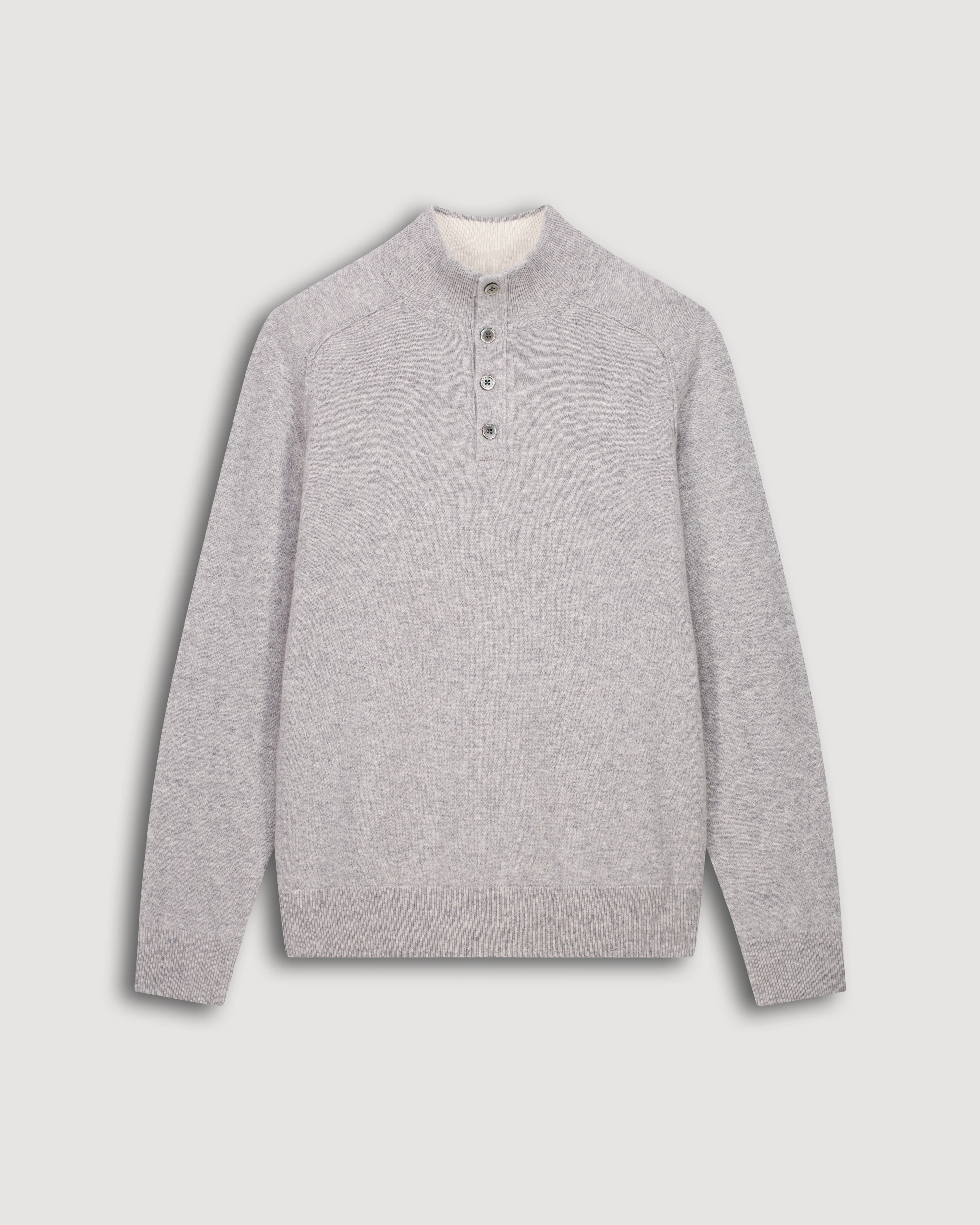 Pull homme à col montant boutonné en laine et cachemire. Coutures apparentes. Bords-côte et détails contrastés au col, aux poignets et à la taille.