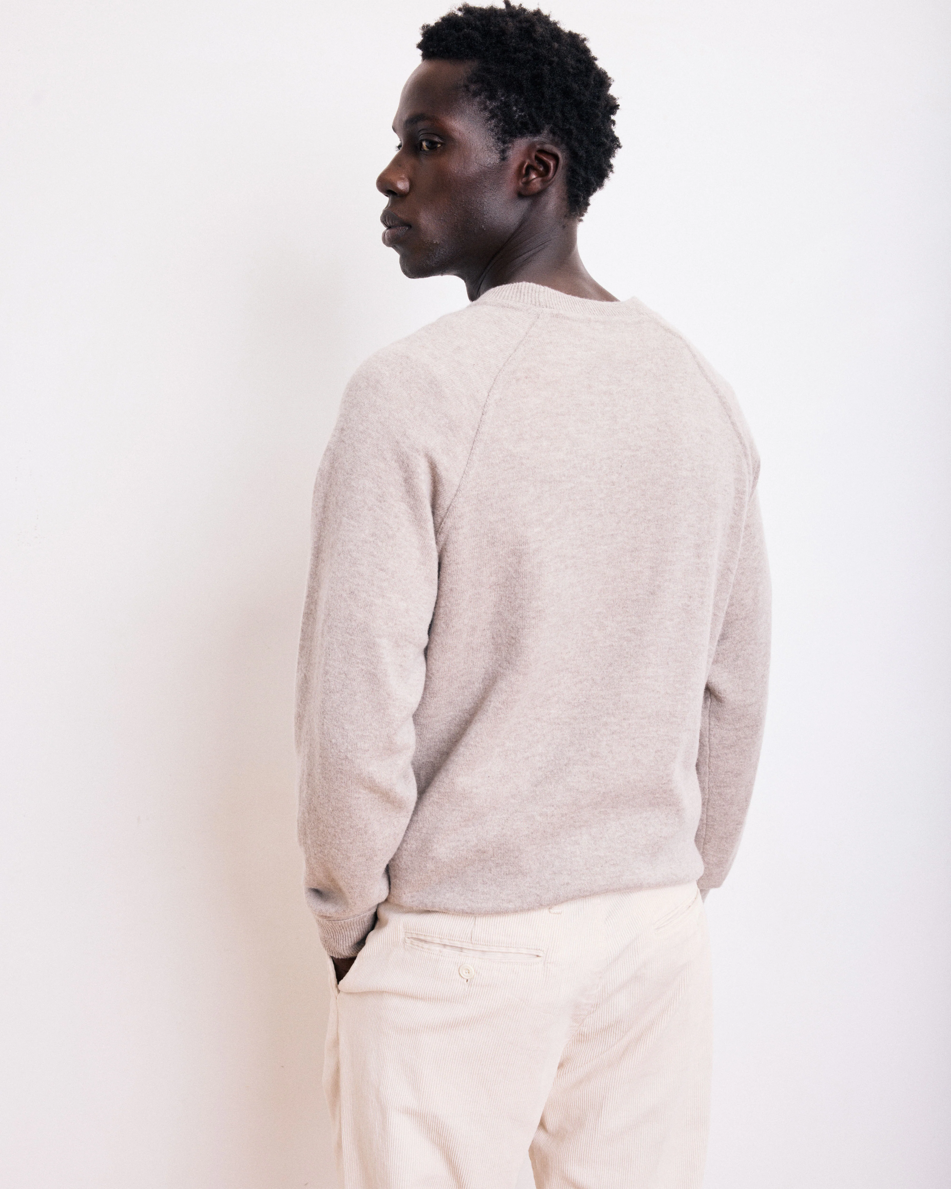 Pull homme col rond Ă emmanchures raglan en laine et cachemire. Coutures apparentes, bords cĂŽtes au col, aux poignets et Ă la taille.