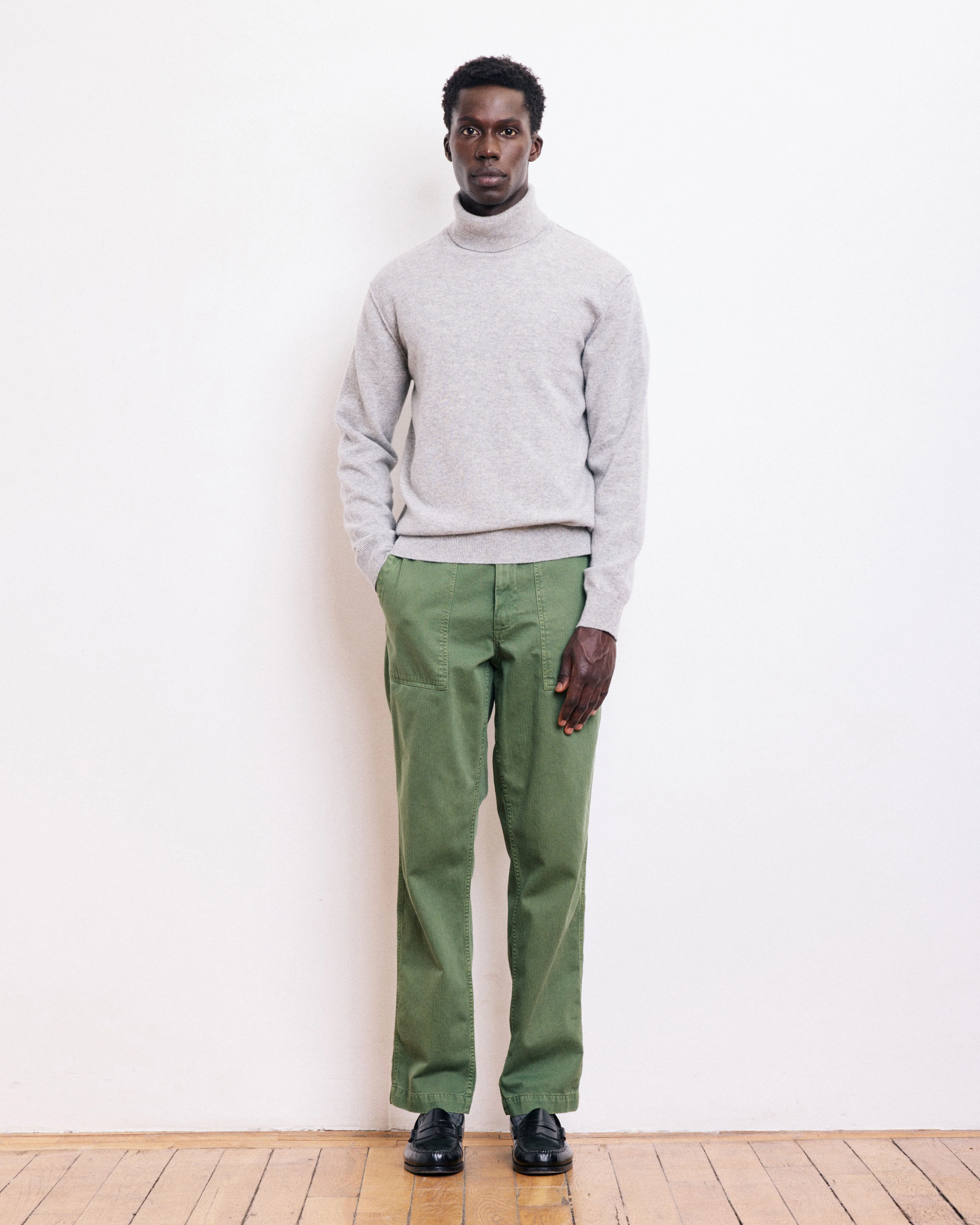 Pull homme à col roulé en laine et cachemire. Coutures apparentes. Bords-côte et détails contrastés au col, aux poignets et à la taille.